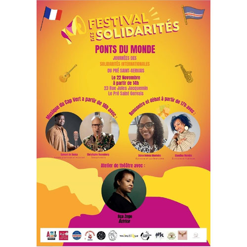 Au programme du Festival des Solidarités : ateliers créatifs Peinture cubiste africaine en musique, espace lecture et bibliothèque éphémère, marque-pages solidaires, atelier de théâtre, bracelets en perles, artistes capverdiens et français – guitare, chant, saxophone – suivi d’un échange sur musique, culture et solidarité.